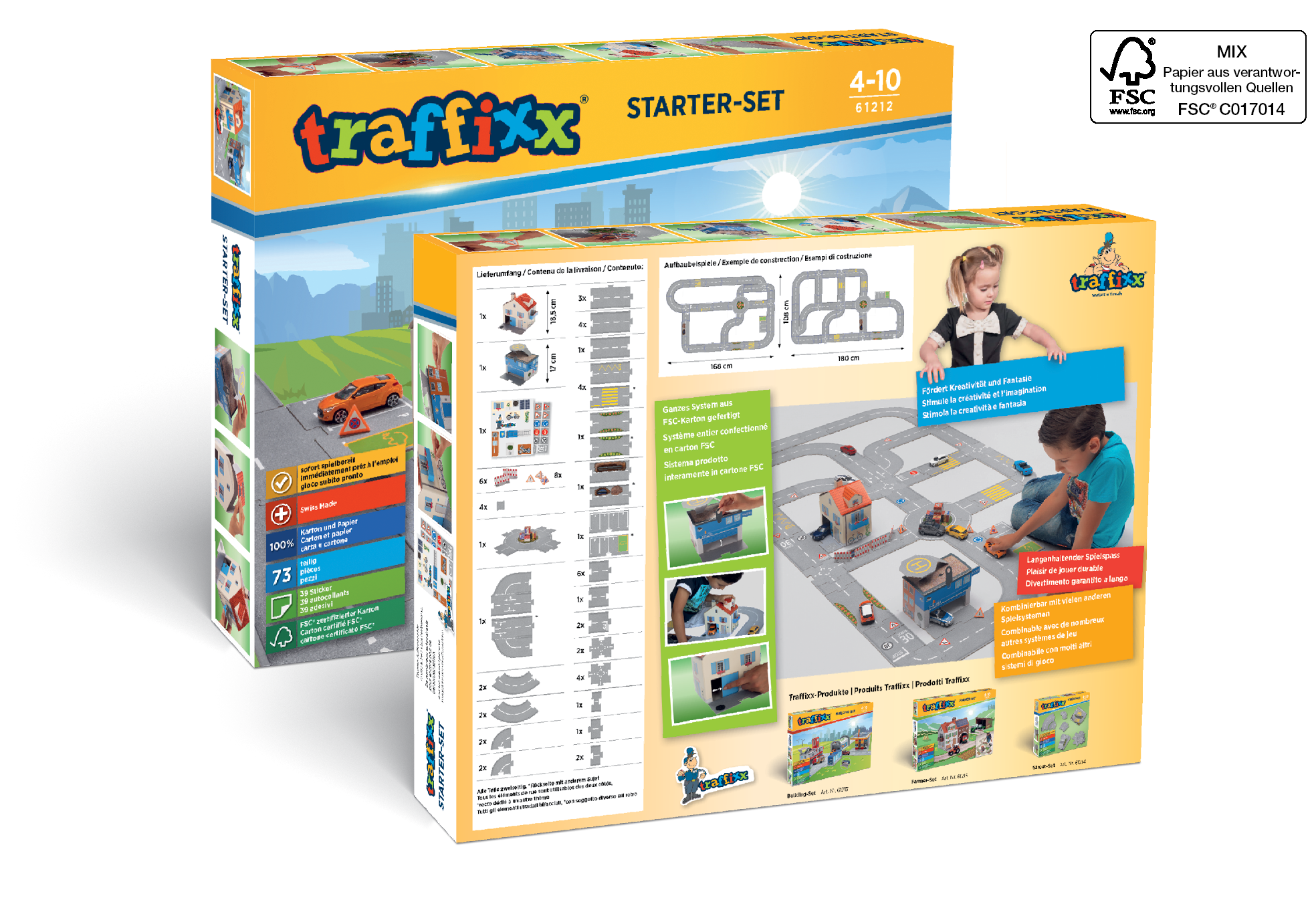 Das Spielsystem Traffixx wird aus hochwertigem FSC-zertifiziertem Karton (aus ökologisch verantwortungsvollen Quellen) in Altstätten (SG/Schweiz) gefertigt. Alle Einzelteile zeichnen sich durch ihre sorgfältige Verarbeitung, Robustheit und Langlebigkeit aus.
